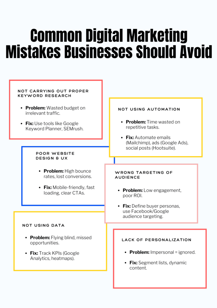 Key digital marketing mistakes to avoid include lacking a clear strategy, ignoring your target audience, neglecting mobile optimization, failing to track analytics, inconsistent branding, and expecting instant results, all of which lead to wasted resources and poor ROI; instead, focus on data-driven decisions, mobile-first design, consistent valuable content, and understanding customer needs across all platforms.